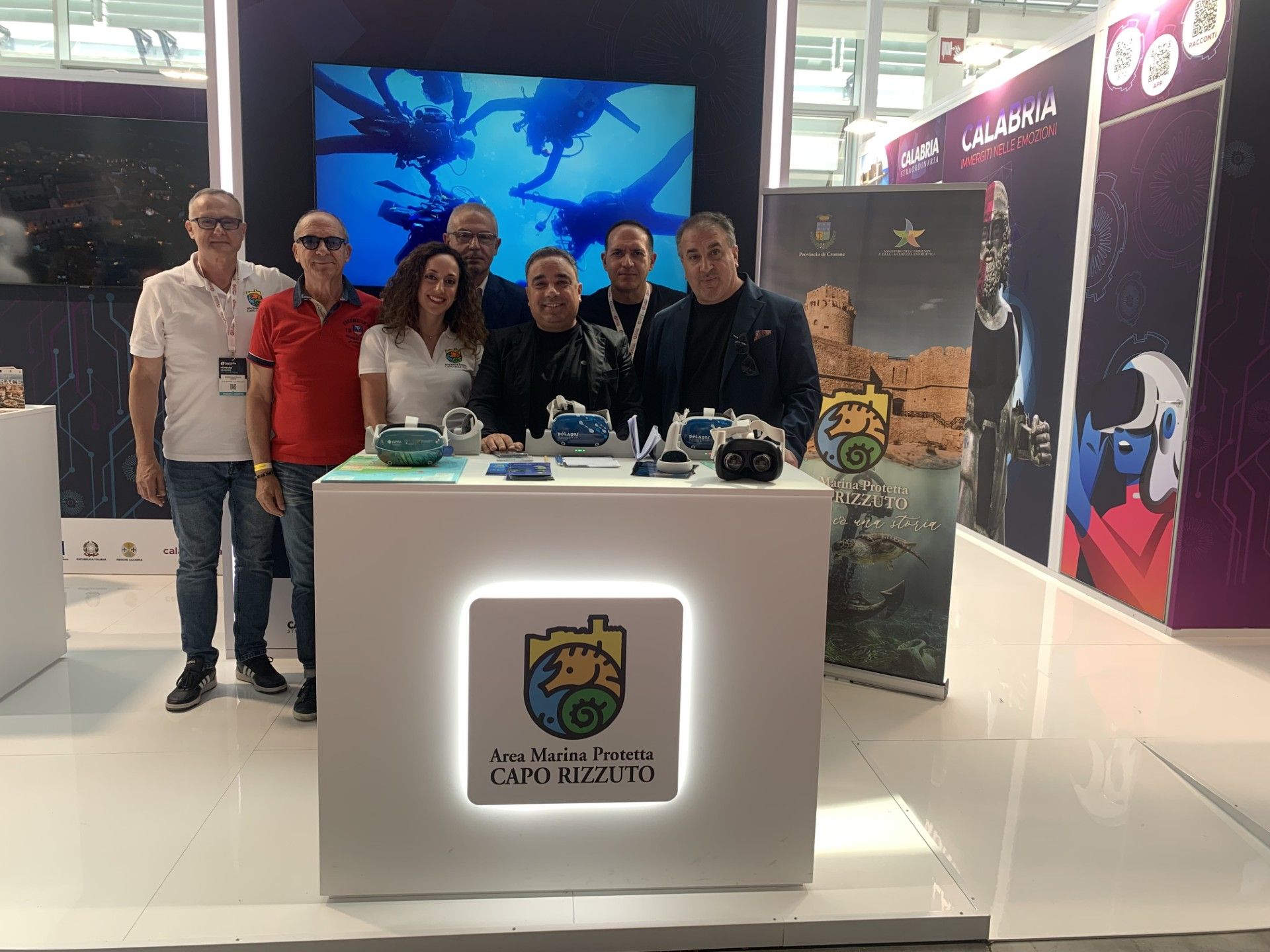 The event was attended by Sergio Ferrari, President of the Province, Raffaele Gareri, Councillor for the Capo Rizzuto Marine Reserve, and Mario Megna, Councillor for Territorial Development. Also present were Arturo Crugliano Pantisano, head of the Marine Protected Area sector, and three members of the Authority’s staff, who coordinated the activities at the stand and welcomed the many visitors who wanted to experience the 3D adventure.